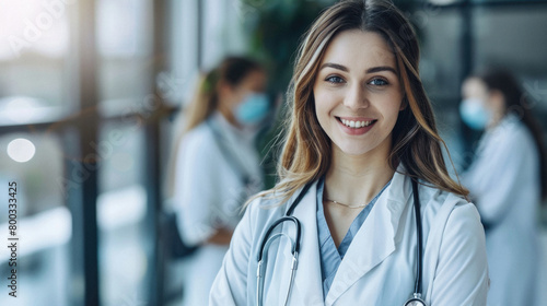 Young happy female doctor standing in medical hospital background. Woman physician therapist or obstetrician wearing uniform looking at camera in clinic. Healthcare medicine concept. Portrait.