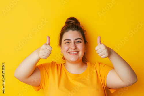 woman, happy, young, female, background, yellow, smiling, portrait, beautiful, adult, body, girl, overweight, showing, people, isolated, fashion, person, positive, studio, model, cheerful, lifestyle, fat, fats, gesture, size, plus, smile, attractive, up, looking, hand, white, thumb, brunette, natural, diet, space, weight, standing, caucasian, large, beauty, slimming, curvy, sport, health