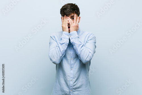 afraid, anxiety, anxious, attack, covering, expression, eye, face, fear, frightened, frustration, hide, looking, panic, scared, stress, panicked, worried, isolated, adult, blue, business, caucasian, cool, feeling, guy, hispanic, israeli, italian, latin, latino, male, man, mexican, model, modern, moustache, nervous, 1, person, portrait, shot, single, spanish, studio, white, young