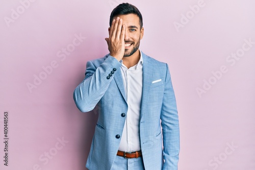 Young hispanic businessman wearing business jacket covering one eye with hand, confident smile on face and surprise emotion.