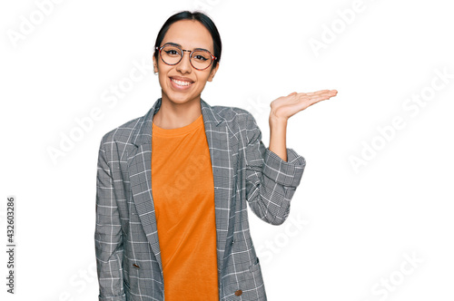 Young hispanic girl wearing business jacket and glasses smiling cheerful presenting and pointing with palm of hand looking at the camera.