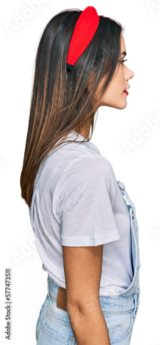 Young hispanic girl wearing casual clothes looking to side, relax profile pose with natural face with confident smile.