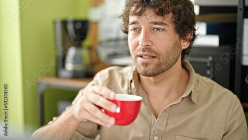 young, hispanic, man, male, guy, adult, person, portrait, photogenic, attractive, business, professional, work, men at work, working, success, manager, boss, employee, elegant, job, successful, drinking, hot drink, drink, beverage, cup, morning, breakfast, serious, relaxed, condensed, sitting, table, desk, office, workplace, indoor, indoor, interior, room, background