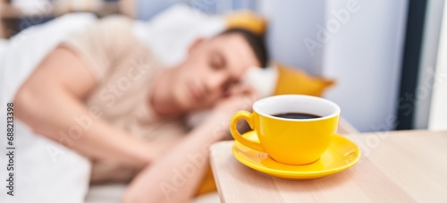 young, hispanic, man, male, guy, adult, person, portrait, photogenic, attractive, lying, relax, relaxing, resting, rest, comfortable, comfort, cosy, relaxed, relaxation, bed, morning, pajama, blanket, pillow, awake, arousing, sleep, sleeping, sleepy, sleepy, exhausted, hot drink, cup, beverage, breakfast, espresso, drink, home, house, apartment, indoor, indoor, interior, bedchamber, room, background
