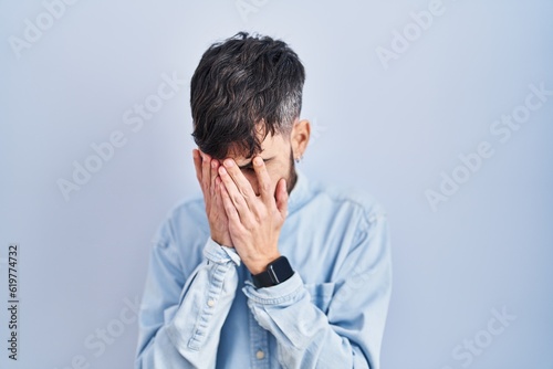 Young hispanic man with beard standing over blue background with sad expression covering face with hands while crying. depression concept.