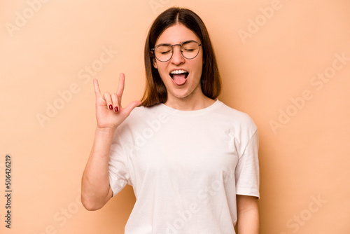 Young hispanic woman isolated on beige background showing rock gesture with fingers