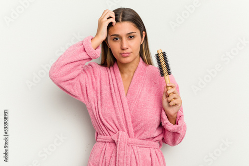 Young Indian woman wearing a bathrobe holding an hairbrush isolated on white background being shocked, she has remembered important meeting.