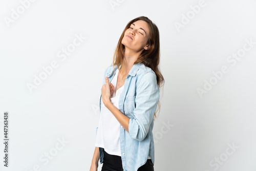 britain, ireland, adult, agreements, background, casual attire, confident, expression, fashion, female, fun, gesture, happy, isolated, lady, people, person, point, positive, proud, satisfaction, slim, studio, success, successful, victory, white, woman, woman, young, girl, himself