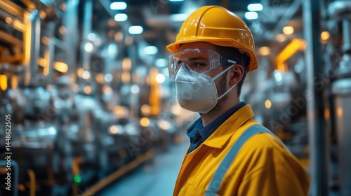 Young male factory worker wearing protective helmet, goggles, and face mask inside industrial plant, perfect for workplace safety, protective equipment campaigns, and industrial visuals