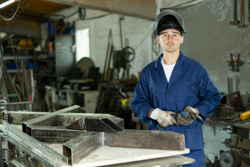 Young male welder posing with welding machine in workshop