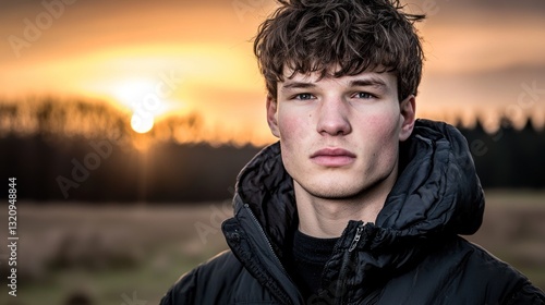 portrait, man, sunset, young, male, person, model, face, boy, guy, human, nature, field, horizon, gold, hours, evening, light, sun, sky, hair, eye, expression, serious, calm, photogenic, attractive, jacket, clothing, style, fashion, photo, image, photo, picture, shot, look, gaze, view, scene