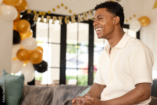 Young man celebrating graduation at home, smiling with joy and excitement