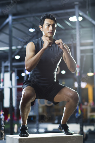athlete, chinese, exercising, gym, young men, confidence, human muscle, sport, well-being, balance, crouching, jumping, people, one person, man, male, one man only, asian ethnicity, adult, adults only, young adult, fashion, healthy lifestyle, lifestyle, hobby, vitality, bodycare, sports equipment, exercise machine, muscular, self-improvement, strength, box, tank top, short, shoe, city, city life, day, flexibility, masculinity, macho, indoor, standing, looking away, china, east asia, asia, beijing, photo, color image, front view, full-length, selective focus, backlit, tiptoe, vertical