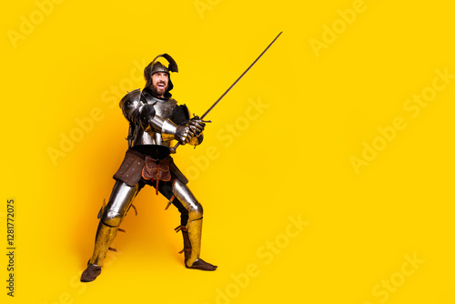 weapon, yellow, man, young, male, knight, armoring, sword, warrior, fighter, costume, mediaeval, historical, royalty, aristocrat, king, prince, nobleman, brave, funny, antique, classic, history, royals, noble, vintage, retro, style, fashion, party, soldier, heroic, bold, bright, combat, steel, plate, pose, energetic, expressive, theatrical, performance, battle, military, guard, hero, copy space, defense, protection