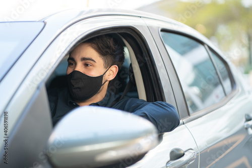 man, face, mask, drive, car, sitting, leisure, road, seat, travel, face mask, driving, city, traffic, outdoors, concept, health care, adult, inside, wearing, young, people, person, male, protective, vehicle, transport, prevention, transportation, health, driver, protection, disease, pandemic, safety