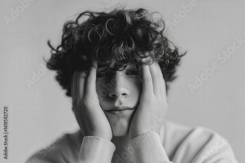 young, man, filled, despair, face, hand, against, clean, monochromatic, background, expression, deep, emotional, tumult, wrestling, overwhelming, thought, feeling, contrast, youthful, feature, simplicity, internal, struggle, another, facet, different, into, distance, lost, contemplation, bright, clear, eye, reflect, earth, dream, aspiration, inviting, woman, beauty, children, hair