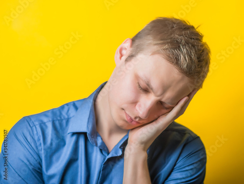 Young man in a blue shirt on a yellow background. wanted to sleep with closed eyes showing fatigue, sleepy, sleepy, hands behind his head. gesture. photo shoot.