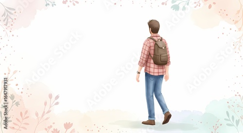 man, young, walking, outdoors, flannel, shirt, backpack, nature, casual attire, summer, adventure, exploration, travel, freedom, hiking, male, stylish, tree, foliage, scene, cool, friendly, relaxed, journey, backview, peaceful, beautiful, scenery, lightweight, active, leisure, lifestyle, path, weekend, wander, wanderlust, happy, fresh, colours, illustration, decorative, trendy, animated, joyful, soft, bright, diverse