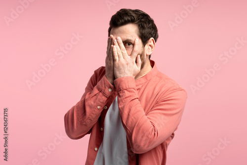 adult, man, peeking, person, portrait, covering, bearded, eye, shame, shock, shy, shyness, standing, studio, surprise, through, wow, middle-aged, young, male, latin, looking, people, expression, face, fear, casual attire, finger, fun, background, afraid, hand, photogenic, finger, cool, wearing, indoor, shirt, guy, hispanic, caucasian, hand, isolated, pink, lifestyle, attractive, confident, sale, stylish