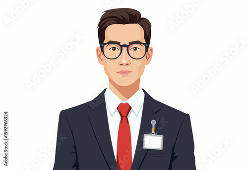 man, young, professional, suit, goggles, identity, badge, formal, business, male, employee, corporate, smiling, presentation, office, indoor, elegant, confident, smart, career, job, identity card, workplace, friendly, clear, character, illustration, graphic, vector, isolation, work, serious, businessman, education, academic, modern, stylish, clean, professionalism, teamwork, leader, office supply, businessman, corporate identity, team, leadership