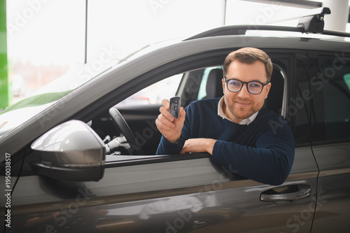 Young man is choosing a new vehicle in car dealership