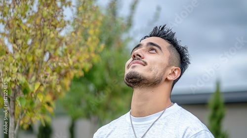man, young, male, adult, person, face, portrait, hopeful, optimistic, looking, up, sky, outdoors, nature, tree, leaf, green, summer, autumn, day, light, sunlight, beard, hair, brown, eye, expression, emotion, feeling, happy, peaceful, serene, calm, relaxed, thoughtful, contemplative, positive, vibrant, photogenic, attractive, smile, head, shoulder, closeup, view, background, scene, image, photo