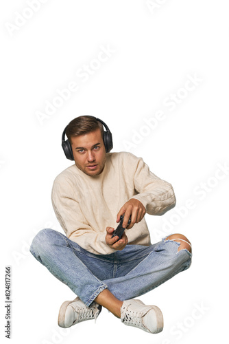 action, adventure, background, casual attire, caucasian, challenge, competitive, concentration, console, controller, digital, dynamic, electronic, engagement, enjoyment, entertainment, excitement, floor, focused, fun, game, gamer, gaming, hobby, indoor, intense, interactive, joystick, leisure, lifestyle, male, man, online, playing, reality, session, sitting, skilled, strategy, studio, technology, video, virtual, white, young