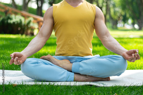 Young man practice yoga in the park. Yoga asanas in city park, sunny day. Concept of meditation, wellbeing and healthy lifestyle