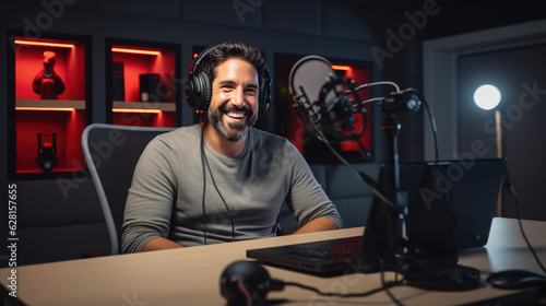 man, radio, podcast, microphone, media, broadcast, studio, broadcasting, stream, online, smiling, laptop, record, host, communication, male, technology, cyberspace, earphones, entertainment, indoor, working, audio, content, live, business, home, recording, talk, streaming, professional, office, digital, blog, video, smile, earphones, sound, creator, multimedia, contraption, young, table, voice, conversation, talking