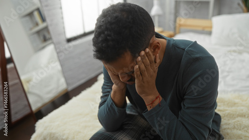 man, young, bedchamber, cephalalgia, indoor, latino, bed, photogenic, home, pain, rest, comfort, relaxation, unwell, pensive, thoughtful, cosy, sick, interior, upset, room, fashion, modern, sleep, sleepy, morning, evening, alone, pajama, blanket, stress, sad, person, homelike, apartment, sorrowful, mood, trouble, daylight, trendy, domestic, furniture, privacy, restful, bedtime, quiet, peaceful, simple, minimalist