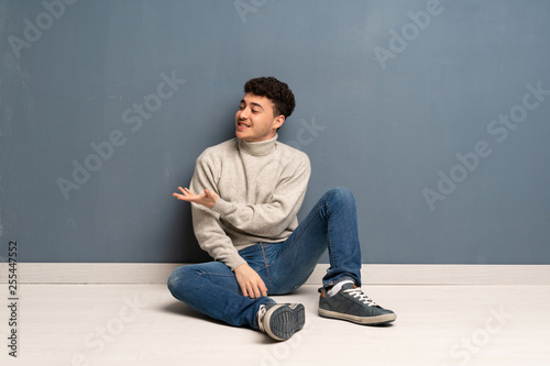 adult, attractive, caucasian, guy, photogenic, hispanic, latin, man, man, people, person, portrait, male, copy space, seat, to sit, floor, wall, blue, full, body, full-length, product, showing, happy, holding, space, presenting, copy, hand, product, palm, smile, cheerful, gesticulate, confident, displaying, pointing, looking, communication, empty, point