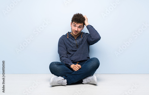 Young man sitting on the floor with an expression of frustration and not understanding