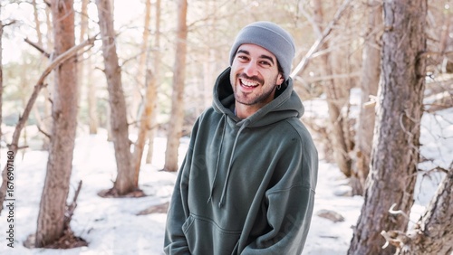 man, winter, forest, snow, smiling, happy, hoodie, beanie, tree, nature, cold, portrait, young, lifestyle, fashion, season, scenic, wood, landscape, adventure, travel, exploration, peaceful, calmness, freedom, joy, cheerful, weekend, get-away, relaxation, solitude, frosty, glacé, white, winterly, day