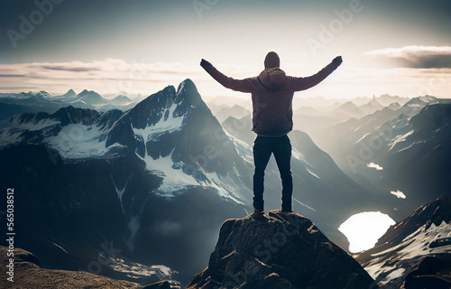 generative, ai, mountain, man, arm, view, guy, inspiration, rock, top, landscape, summer, travel, nature, success, mountain, lifestyle, vacation, person, environment, camping, adventure, young, hiking, happiness, freedom, tour tourism, wanderlust, trekking, cliff, holiday maker, mountaineering, harmony, hill, explorer, relaxation, up, relaxing, male, 1, standing, sky, peak, climbing, outdoors, summit, hiker