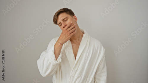 man, young, white, bathrobe, isolated, background, sleepy, sleepy, portrait, photogenic, adult, guy, attractive, morning, expression, male, sleep, face, yawn, relaxed, arousing, bedchamber, home, relaxation, robe, racked, person, casual attire, carefree, rest, comfort, daily, routine, lifestyle, look, day, simple, minimal, fashion, fresh, groomed, cosy, clean, modern, hygiene, washing, awaken, leisure