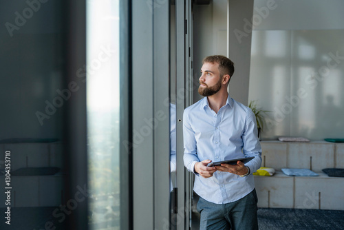 young, man, tablet, modern, office, window, environment, technology, 1, people, computer, adult, business, male, digital, workspace, occupation, caucasian, work, interior, businessman, professional, corporate, job, natural, light, relaxation, focused, looking, shop, city, pensive, thinking, retail, innovation, design, manager, life, entrepreneur, contemplation, standing, trade, urban, outdoors, inside