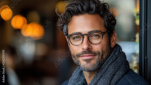 Young man with curly hair and glasses smiling in a cozy cafe during daytime. Generative AI