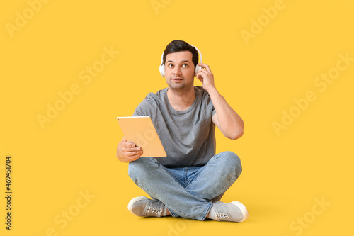 Young man with tablet computer and headphones on color background