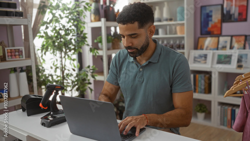 man, young, hispanic, store, home, interior, laptop, decor, working, attractive, shop, indoor, business, technology, plant, furniture, shelf, keyboard, concentration, digital, workspace, office, setup, photogenic, adult, casual attire, sharpened, browsing, screen, table, contraption, device, work, decorative, tied-up, modern, occupation, merchandise, arrangement, stylish, male, beard, clothing, client, transaction, youth, display, indoor
