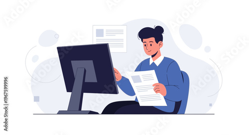 Young man working on computer, reviewing documents, modern office illustration
