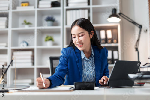 businesswoman, office, working, tablet, note, notebook, writing, desk, modern, shelf, document, manager, young, smiling, technology, business, work, professional, female, executive, career, corporate, workplace, computer, digital, communication, cyberspace, online, connection, information, planning, strategy, analysis, finance, accounting, project, task, success, achievement, growth, development, skill, expertise, education, learning, happy, confident, asian, asia