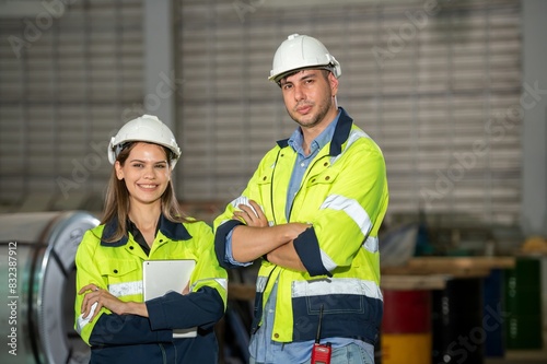 Young men and women engineer supervisor leader and worker with helmet standing smile and hand Cross arms over chest at construction factory site with teamwork for happy working in factory site.
