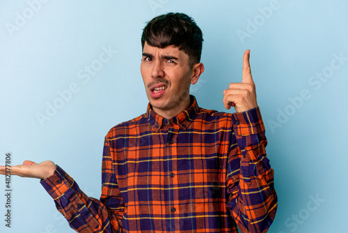 Young mixed race man isolated on blue background holding and showing a product on hand.