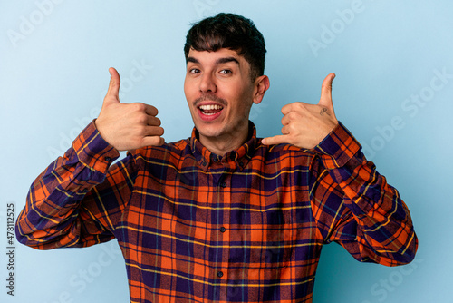 Young mixed race man isolated on blue background showing a mobile phone call gesture with fingers.