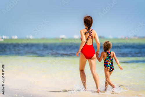 Young mother and little daughter running on the beach in Dominican Republic