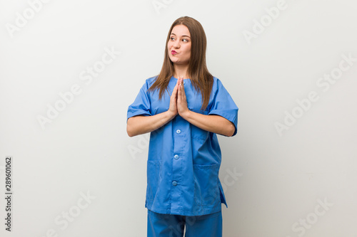 Young nurse woman against a white wall making up plan in mind, setting up an idea.