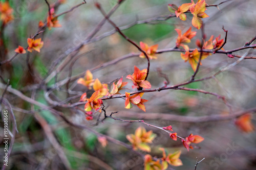spring, fruitbody, leaf, branch, nature, orange, red, growth, seasonal, macro, soft focus, bokeh, garden, shrub, plant, germinating, new life, botanical, twig, fresh, flora, autumn color, fall foliage, texture, background, natural, wood, forest, bright, vibrant, gardening, ecology, environment, deciduous, awakening, blurred background, closeup, delicate, aesthetic, wallpaper, landscape, change, vitality, morning light, transition
