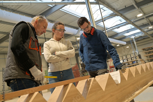 carpenter's shop, carpenter, joiner, training, apprentice, apprenticeship, trainee, young people, girl, man, mature, measuring, woodwork, men at work, instructor, teacher, trainer, wood, workshop, tool, machinery, control, indoor, professional