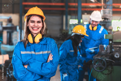Young people worker in protective uniform operating machine at factory Industrial.People working in industry.Portrait of Female Engineer looking camera at work place.