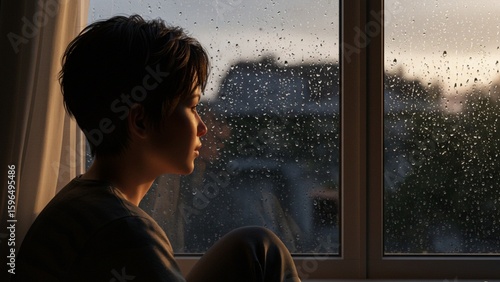 Young person contemplating life looking out rainy window at dusk
